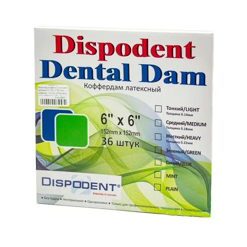 Платки латексные (раббердам) «Dispodent Dental Dam», ПЛОТНЫЙ, 0.22 мм, 36 шт Дисподент (СИНИЙ)